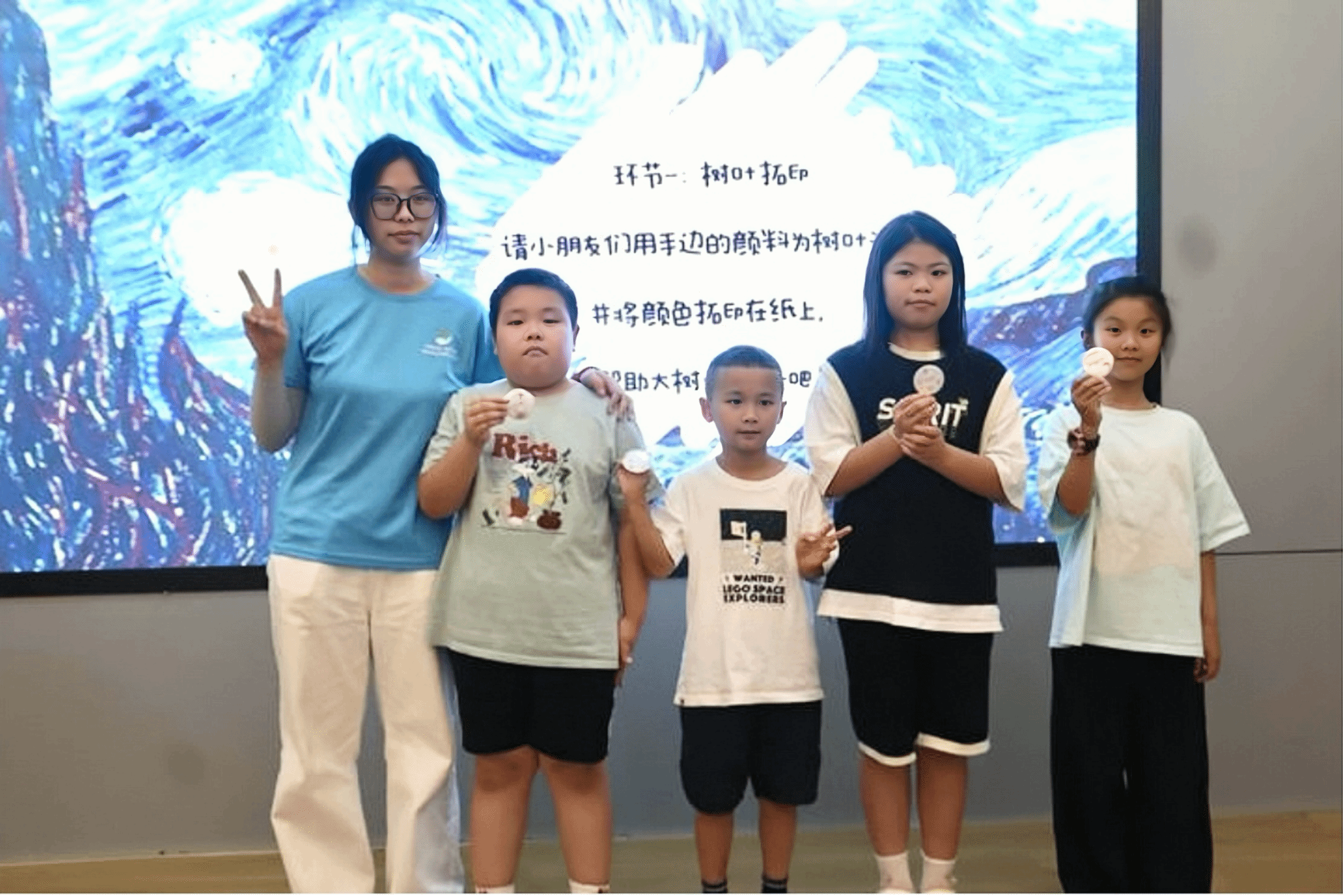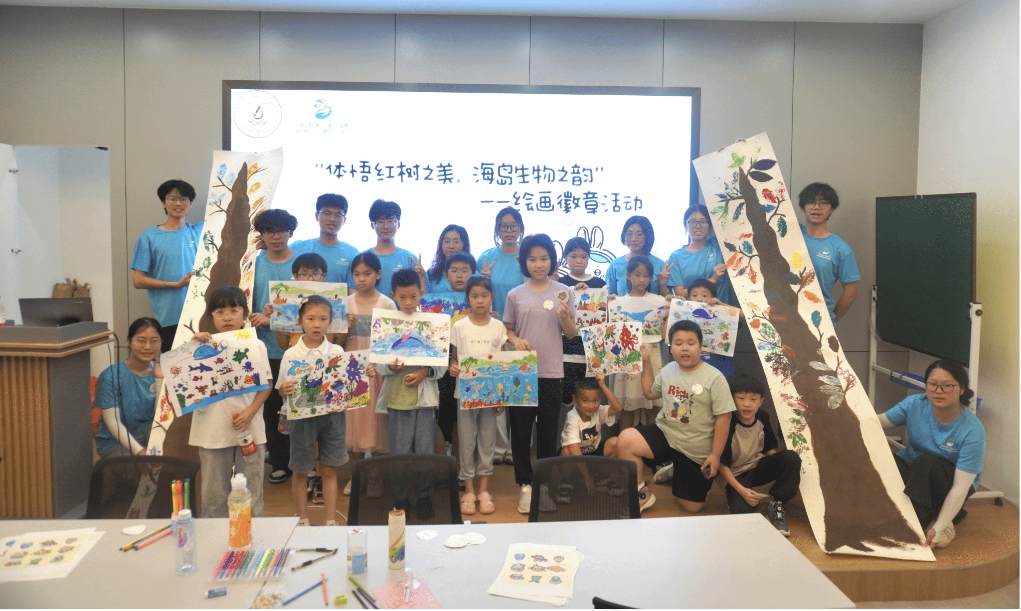 “江豚好漂亮,我好想亲眼看看它们呀”,小营员们在观看美丽的江豚照片时发出阵阵惊呼。在“童”心共绘生态蓝图的主题课堂上,小老师用浅显易懂的语言和生动有趣的照片,介绍了各种海洋生物,引导小营员们绘制了一幅幅自然生动的海洋主题儿童画,共同设计并制作了独一无二的海洋生物徽章,极大地激发了孩子们对海洋的浓厚兴趣。