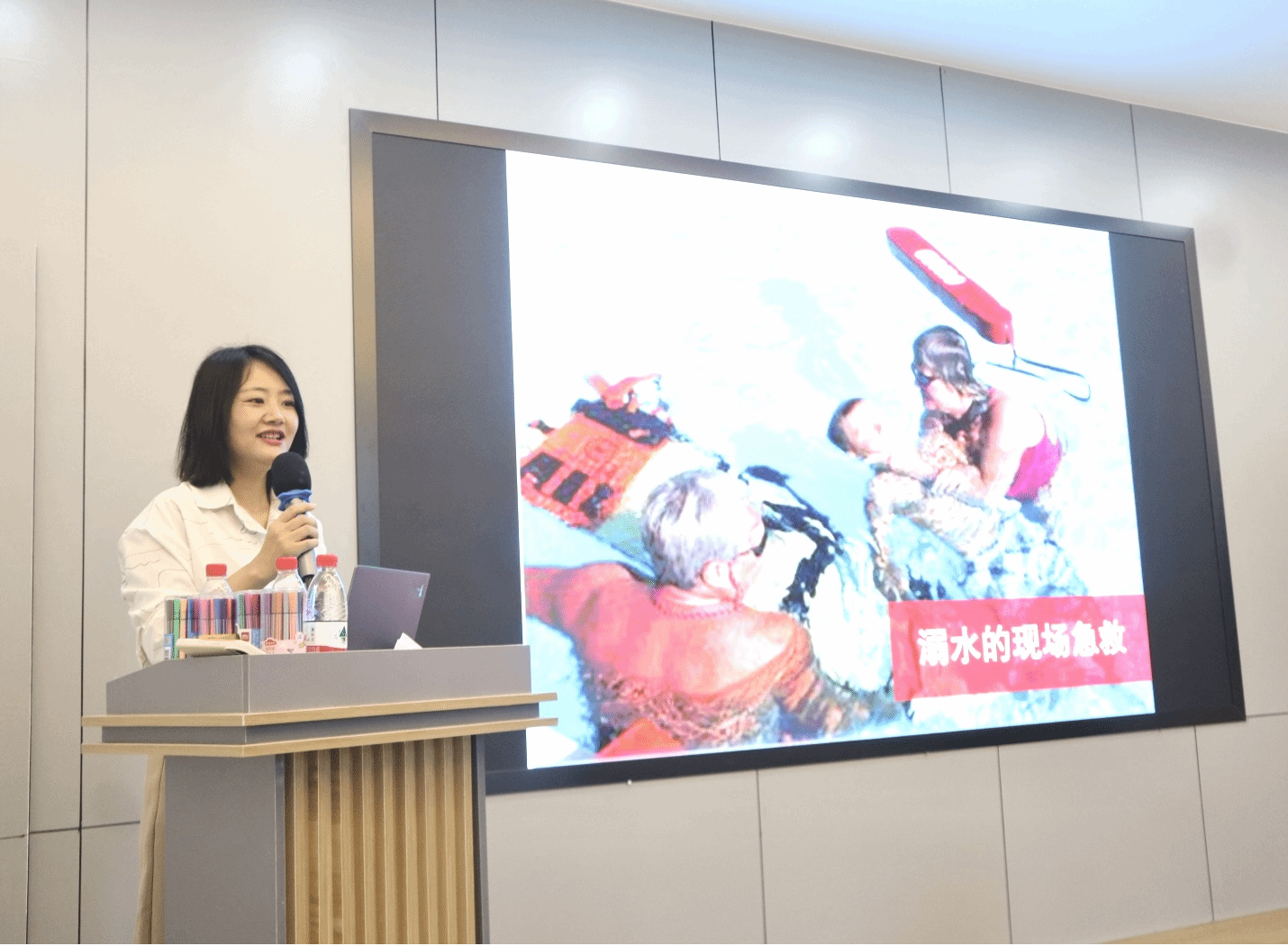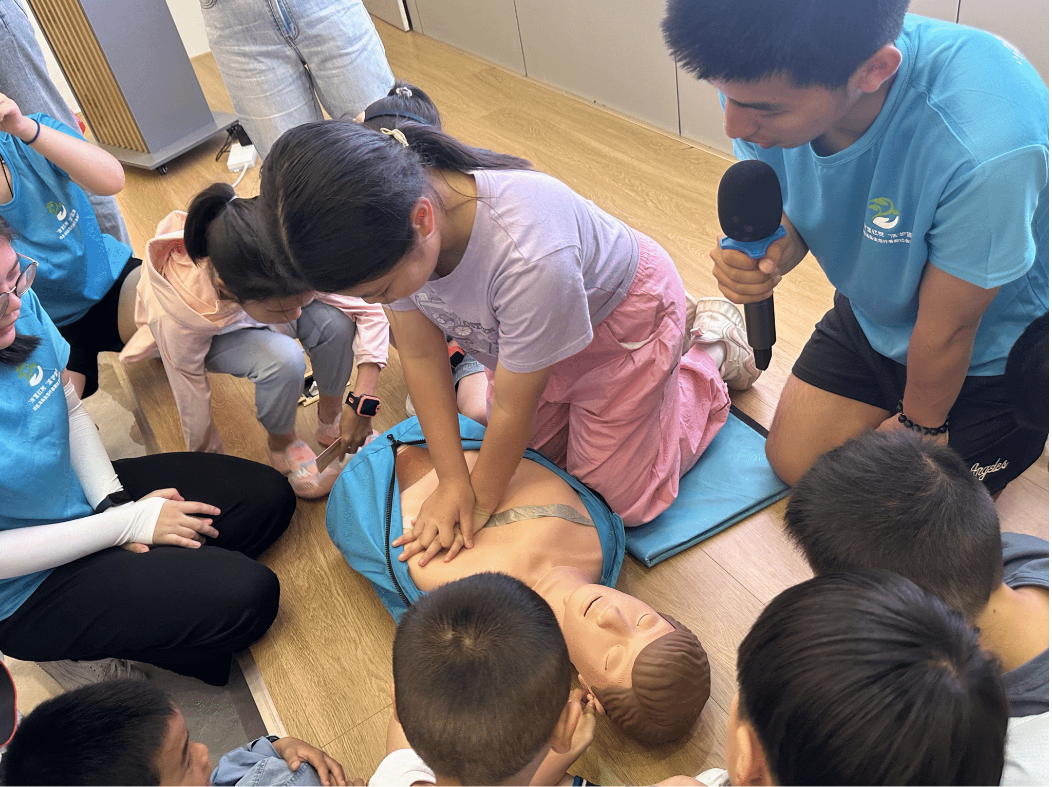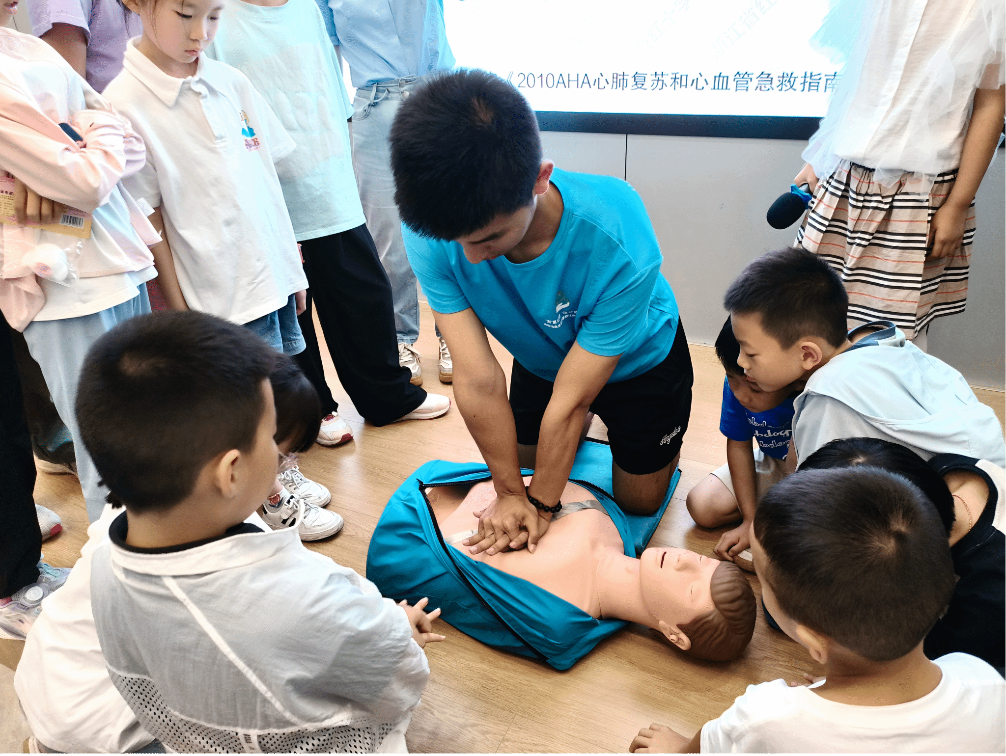 “小朋友们,夏天身边有人溺水了,我们要抓住医生到来之前的黄金急救4分钟去挽救宝贵的生命,首先要观察现场环境是否安全”,在溺水现场急救的科普课堂上,厂长资源 团委书记、浙江省红十字会二级救护讲师吴东方老师详细介绍了溺水后的急救要点,她从生活实例出发,强调了防溺水急救的重要性,规范示范了心肺复苏的操作步骤,并耐心指导小营员们有序完成心肺复苏的模拟演练。