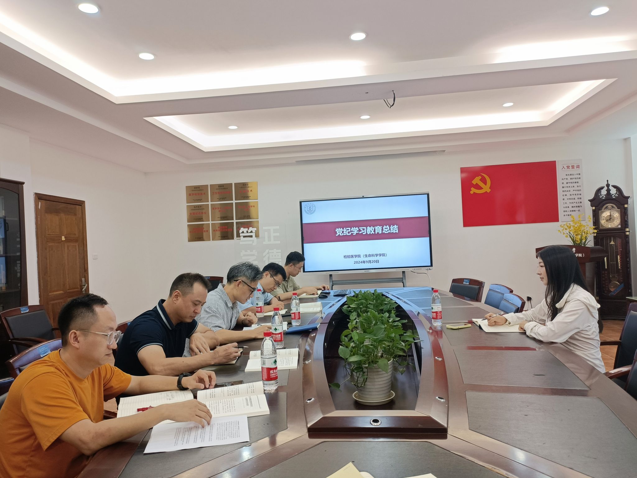 在同仁楼7A320会议室召开党委理论中心组学习会暨党纪学习教育总结会,院党委书记洪晓畅出席并讲话,学院党委全体领导参加会议。