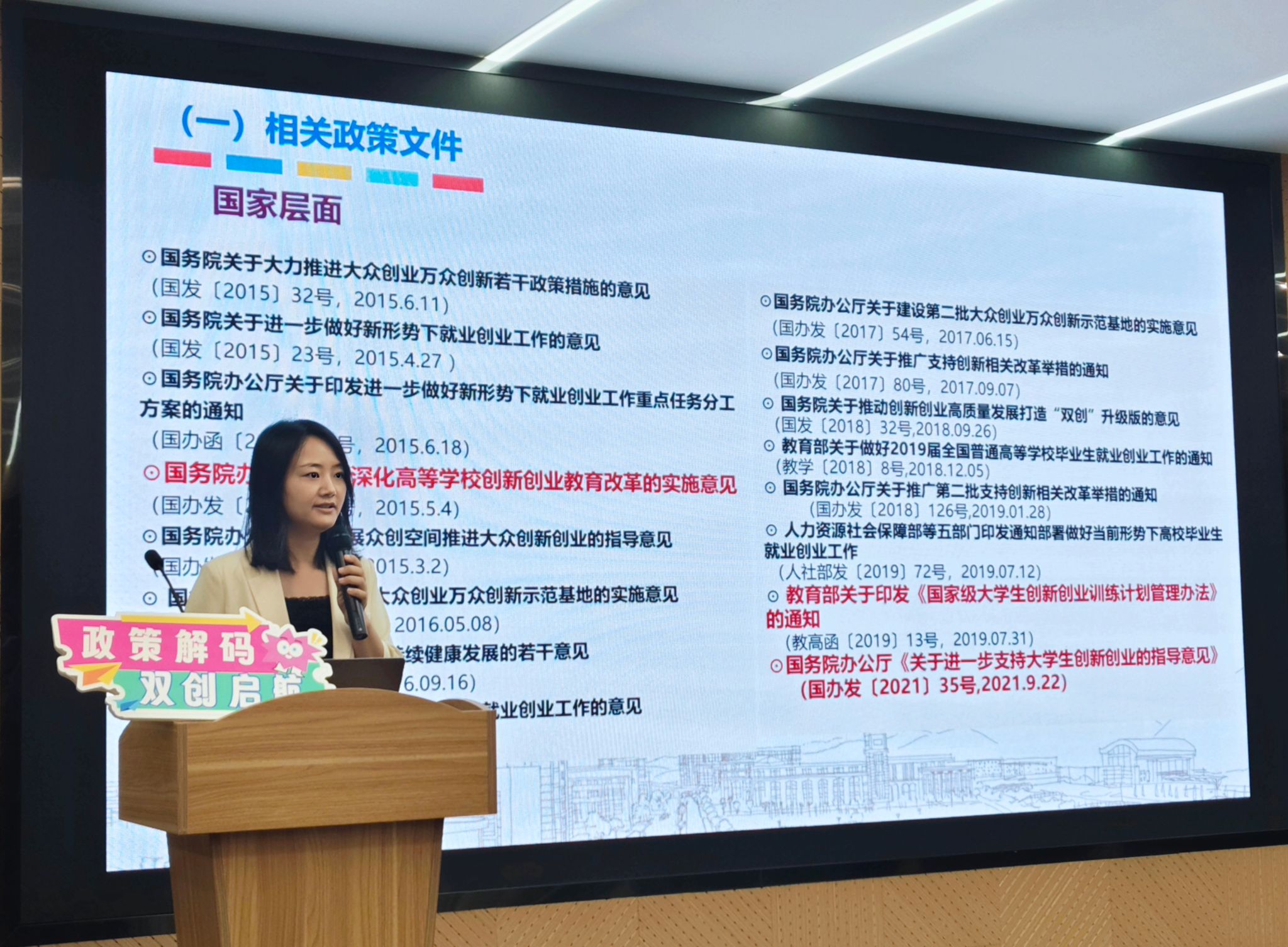 团委于6A107智慧教室举办了“政策解码,双创启航”主题的双创讲座。此次讲座由院团委书记吴东方主讲,同时邀请了三位在创新创业方面有突出成绩的同学分享经验。