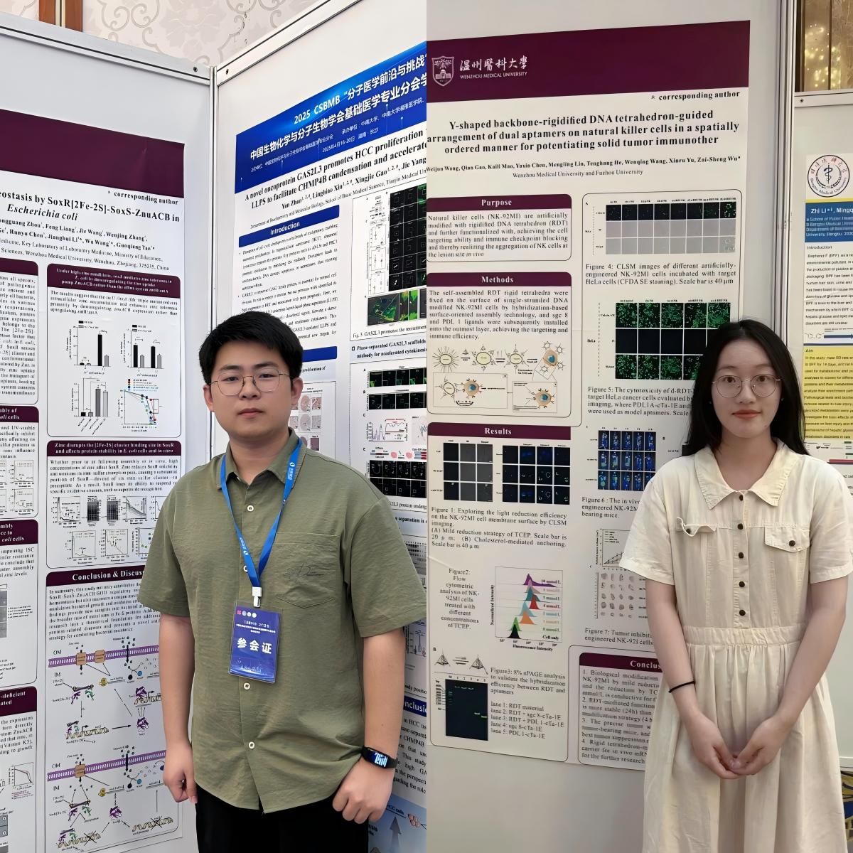 硕士研究生冯杰和硕士研究生茅凯丽分别分享了题为《Regulation of zinc homeostasis by SoxR[2Fe-2S]-SoxS-ZnuACB in Escherichia coli》和《Y-shaped backbone-rigidified DNA tetrahedron-guided arrangement of dual aptamers on natural killer cells in a spatially ordered manner for potentiating solid tumor immunother》的学术墙报,经投票评选,硕士研究生冯杰分享的学术墙报《Regulation of zinc homeostasis by SoxR[2Fe-2S]-SoxS-ZnuACB in Escherichia coli》荣获大会优秀墙报。