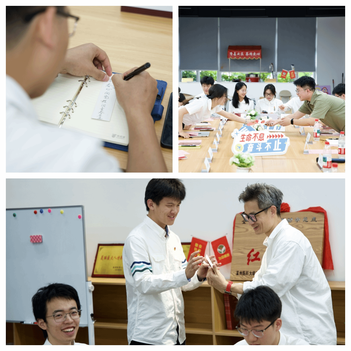 座谈会最后的“检”写报告单环节,师生们把自己关于理想信仰、志愿奉献、青春青年等方面的祝福、感悟写在书签上,或收藏或交换,作为对“五四”精神的郑重回应与承诺。