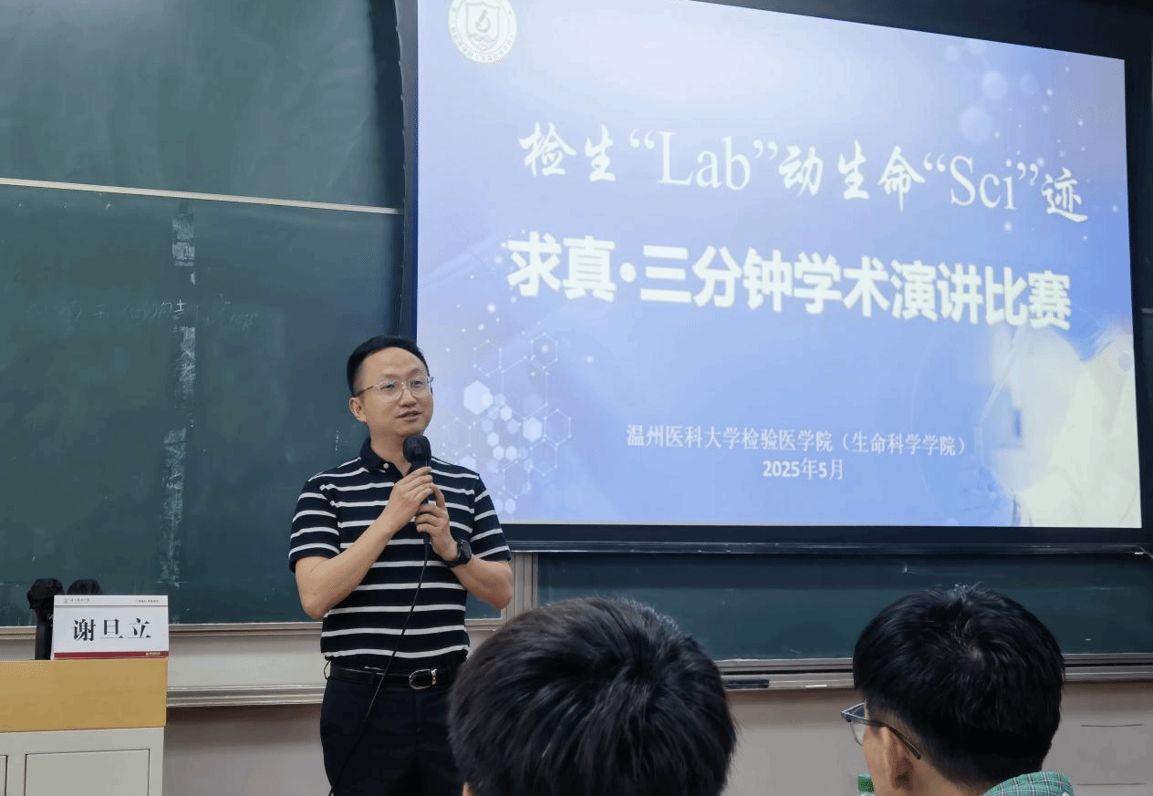 在6A207举办“检生‘Lab’动·生命‘Sci’迹”3分钟学术演讲比赛。此次比赛由院团委和教学办联合举办,学院副院长谢旦立出席并致辞。