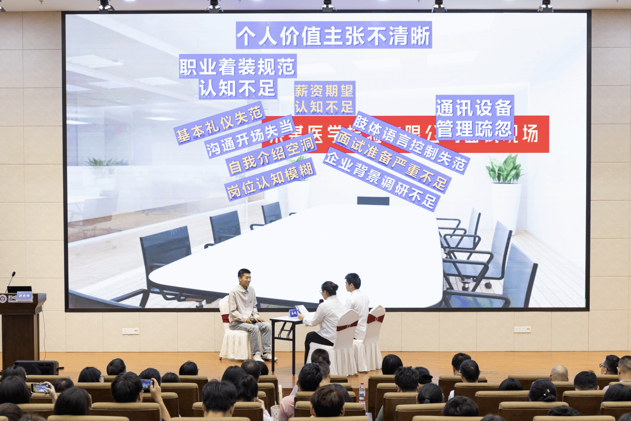 会上,学生自编自导的求职诊断情景短剧《面试那些“坑”》,生动还原求职面试真实场景,精准“把脉”求职痛点,为学生提供求职面试“避坑指南”。