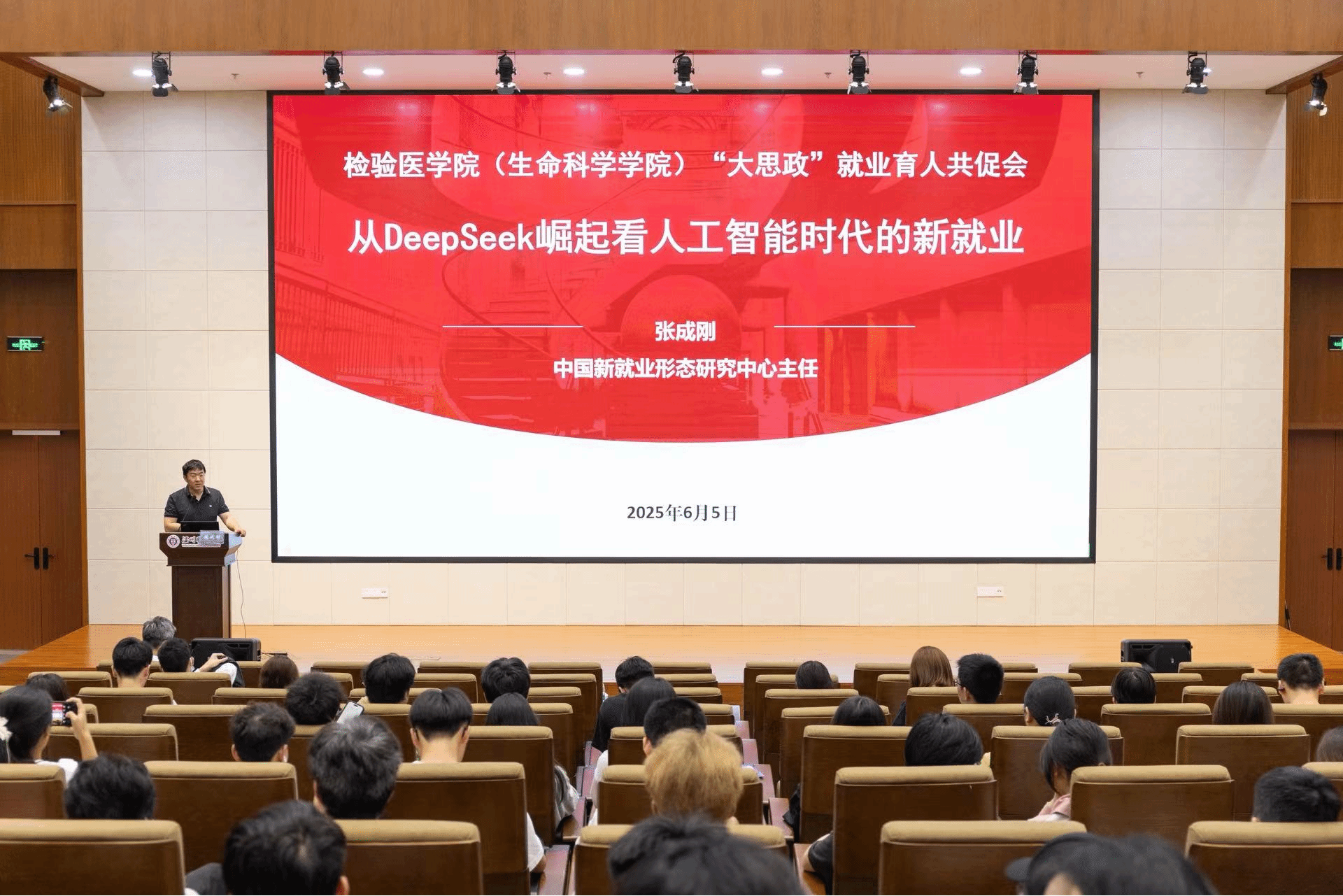 中国新就业形态研究中心主任张成刚作《从DeepSeek崛起看人工智能时代的新型就业》主题报告,他以“新一代人工智能崛起,未来劳动力市场长什么样”引出话题,阐述了人工智能时代大学生就业的机遇与挑战,以及何为好的就业。他强调,技术革命会颠覆行业格局,AI驱动的经济时代即将来临。大学生应积极投身可积累经验技能的行业,秉持快速学习与终身学习理念,善于整合资源激发“轻创业”“超级个体”热情,为中国式现代化挺膺担当。