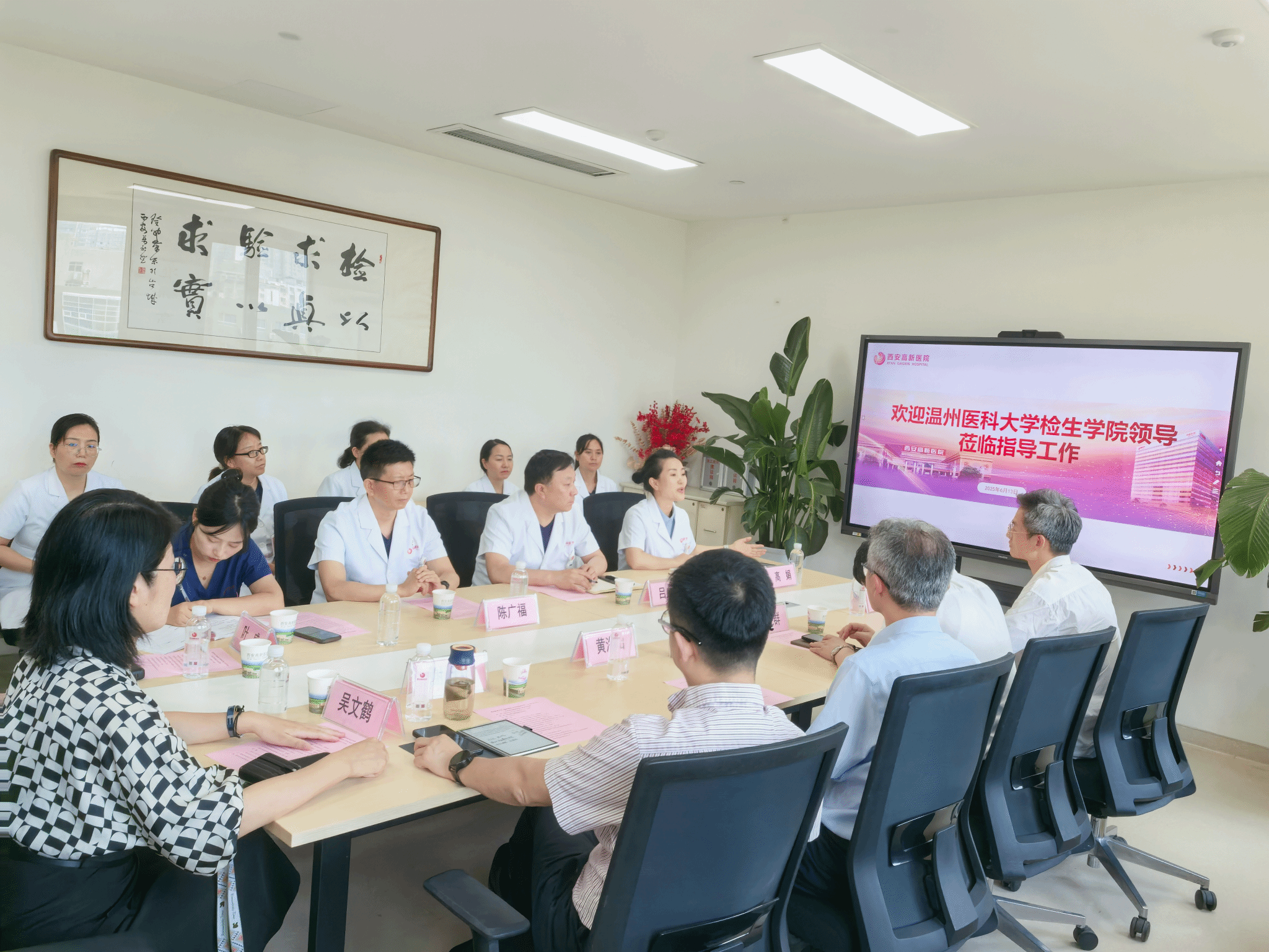 随后,团队来到西安高新医院。常务副院长吕良山主持实习教学检查会议,检验科主任高娟全面汇报带教工作、学生表现与教学成果。在教师座谈环节,双方带教老师畅所欲言,分享临床带教心得,就加强院校协作、提升教学质量、缓解学生就业压力等议题深入交流。郑晓群院长感谢医院的辛勤付出,并提出深化合作建议;吕良山常务副院长肯定合作成果,期待双方携手迈向新高度。