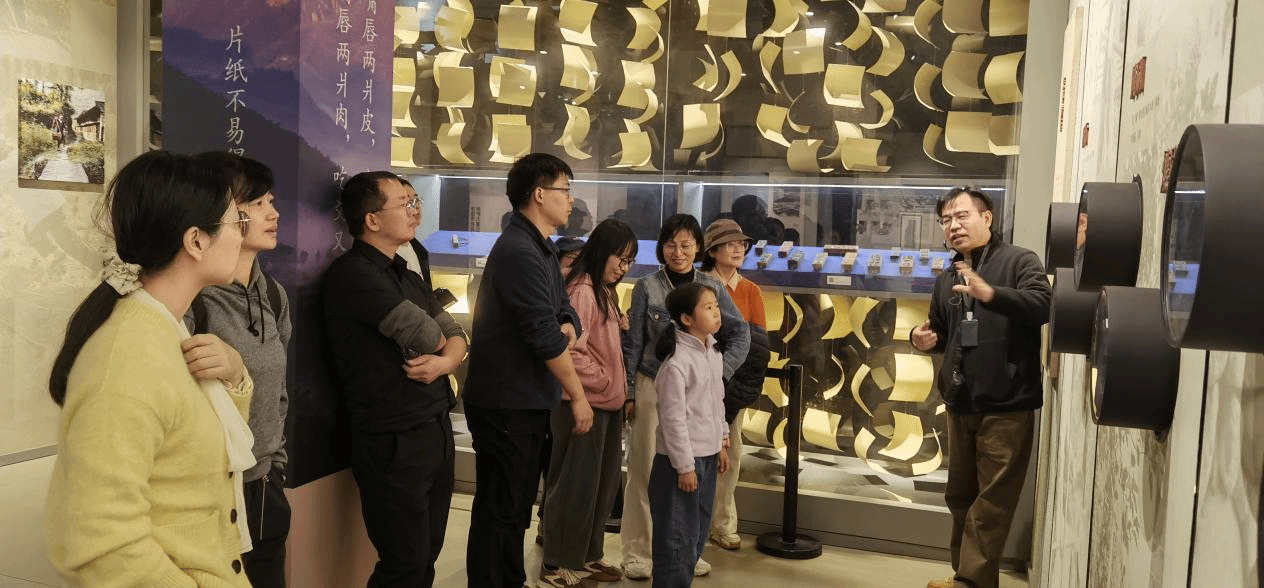 随后,教职工与孩子们一同走进泽雅传统生态造纸博物馆,探寻被誉为中国造纸术 “活化石” 的泽雅屏纸制作技艺。在讲解员的专业引导下,大家系统了解了这项 2014 年入选国家级非物质文化遗产的传统工艺, 从砍竹、腌刷、煮料,到捣刷、捞纸、焙干,数十道繁琐精细的工序,每一步都凝聚着匠心与智慧。博物馆内陈列的水碓、纸帘等古老工具,以及生动还原的古法造纸场景,让孩子们不时发出阵阵惊叹,家长们则借此契机,向孩子传递文化传承的重要意义。通过沉浸式参观体验,大家不仅深切感悟到泽雅人 “以纸为业、与水共生” 的生存智慧,更对 “千年纸山” 所承载的厚重历史文化与传承力量心生敬意,进一步增强了文化自信与传承意识。
