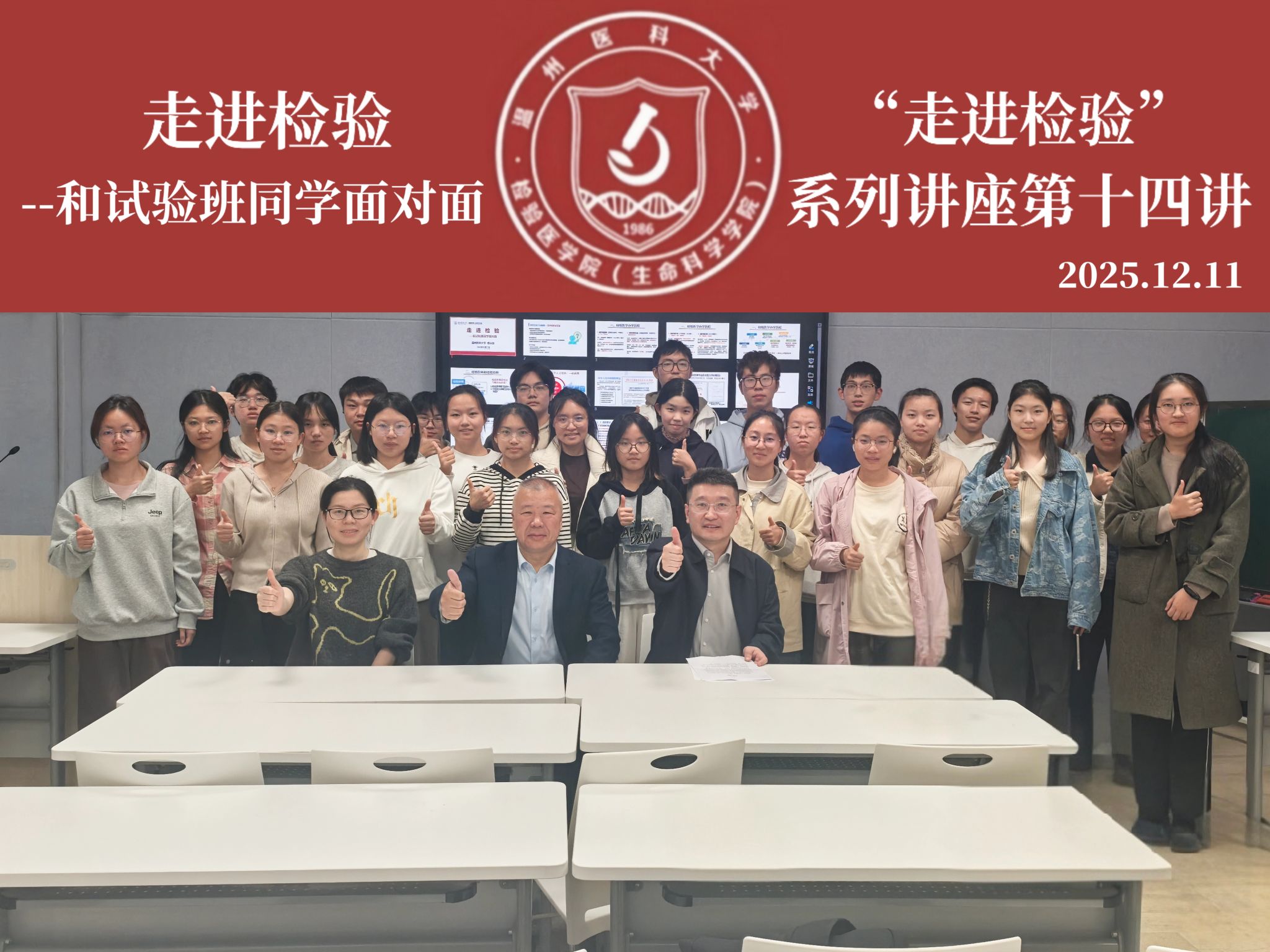 1211日,本学期走进检验”系列讲座第十在智慧教室6A302举行。教育部高等学校医学技术类专业教学指导委员会委员,浙江省高等学校医学技术类专业教学指导委员会副主任委员楼永良教授就检验医师的办学历程、人才培养和职业发展以及在临床诊断中的作用等内容与2025级临床医学(检验医师培养试验班)的同学进行了深入交流,本次活动由班主任邢超主持,教学办主任陈晨出席。