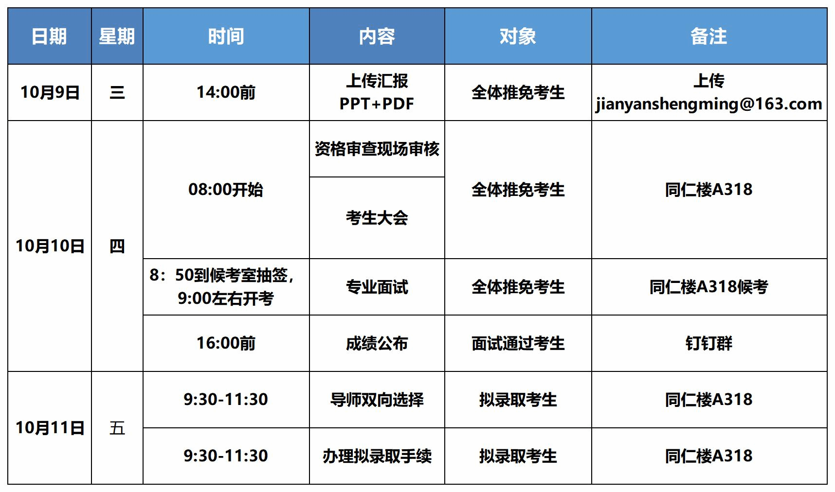 (一)复试候考时间:10月10日上午8:30