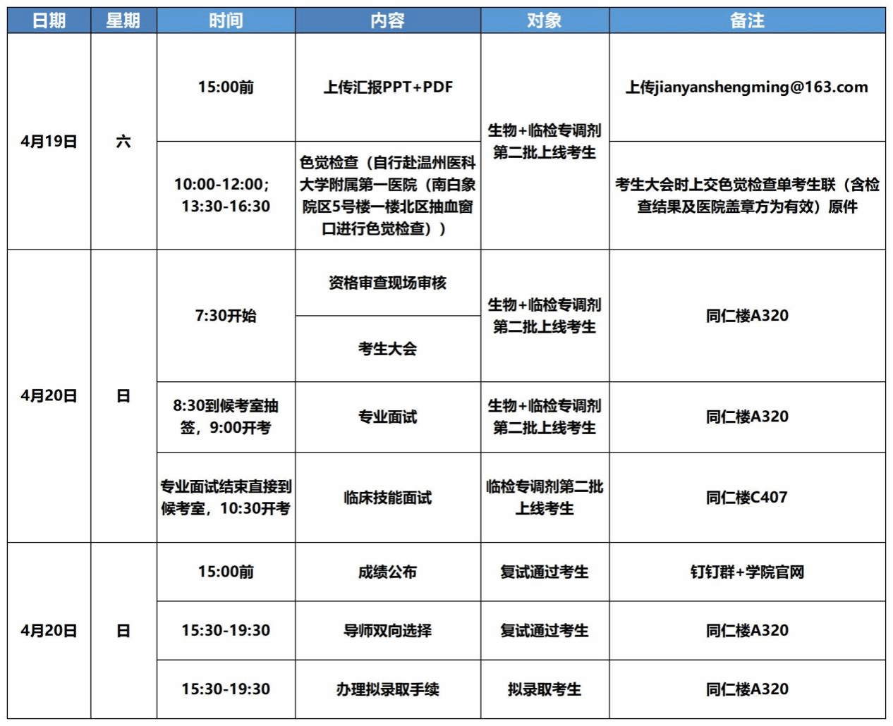 2025年硕士研究生复试录取工作方案》文件精神,现将硕士研究生(生物学学术型、临床检验诊断学专业型)第三批考生调剂复试安排情况通如下: