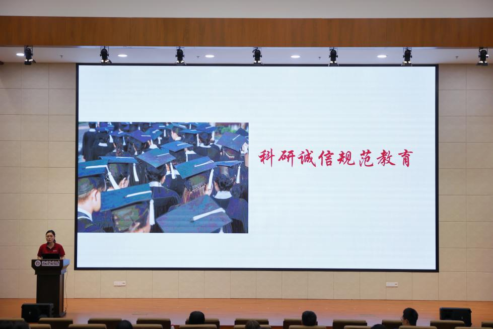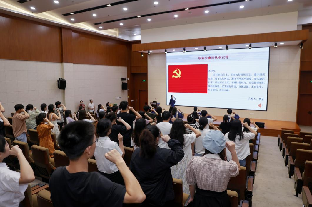 学位与研工办老师们对即将走向社会的毕业生们开展了廉洁从业教育与科研诚信教育。林虹老师结合未来同学们在工作中可能遇到的实际情况为同学们敲醒了警钟,同时引导同学们做好科研诚信。苏程老师引导毕业生们扣好走向社会的廉洁第一扣,做到慎初、慎微、慎独、慎行;要恪守廉洁诚信,懂得明辨是非。最后,在冯春林同学的带领下全体毕业生高举右手、庄严宣誓,誓言铮铮在报告厅久久回荡。