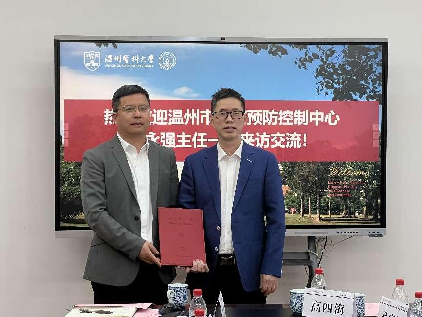 郑晓群执行院长对邵永强主任一行的到来表示欢迎,并从学科建设、人才培养、科学研究等方面介绍了学院历年来取得的成果。邵永强主任介绍了温州市疾控中心发展历程、基本情况和各部门的主要职责。