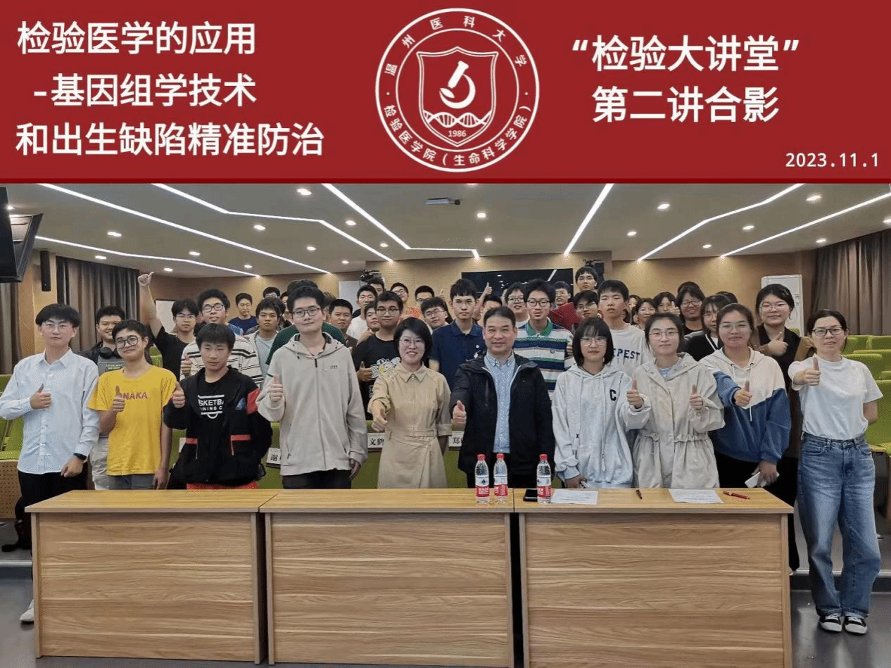 11月1日晚上,本学期第二场“检验大讲堂”系列讲座在茶山校区同济楼智慧教室6A107举行。温州市人民医院、温州市妇女儿童医院生殖遗传科郑加永教授与2022、2023级临床医学(检验医师培养试验班)的同学们深入交流,就遗传物质的发现、基因组学技术的发展,二代测序技术在出生缺陷防治和遗传病诊断中的应用等方面进行了讨论。本次活动由吴文鹤老师主持。