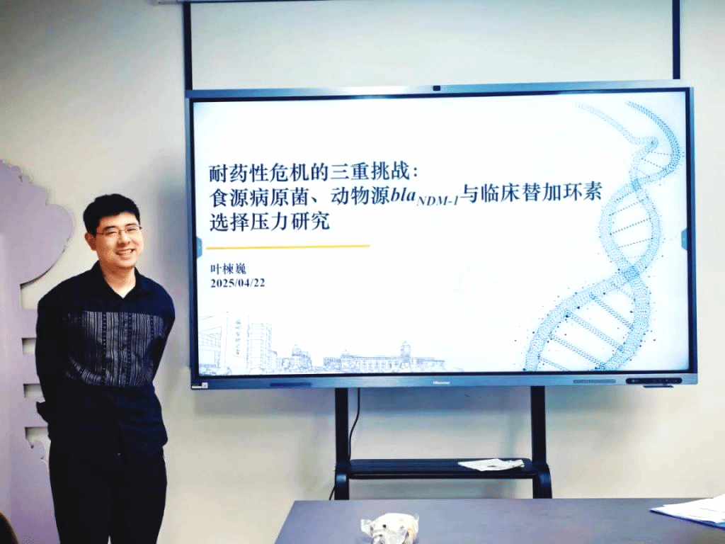 2025年4月22日下午,求真讲坛(院内专场)系列讲座之“耐药性危机中的三重挑战:食源病原菌、动物源blaNDM-1与临床替加环素选择压力研究”在生物医药科研大楼南702会议室举行。本次论坛由学院副院长黄海山主持,叶楝巍博士主讲,学院青年科研人员参加了本次学术交流活动。
