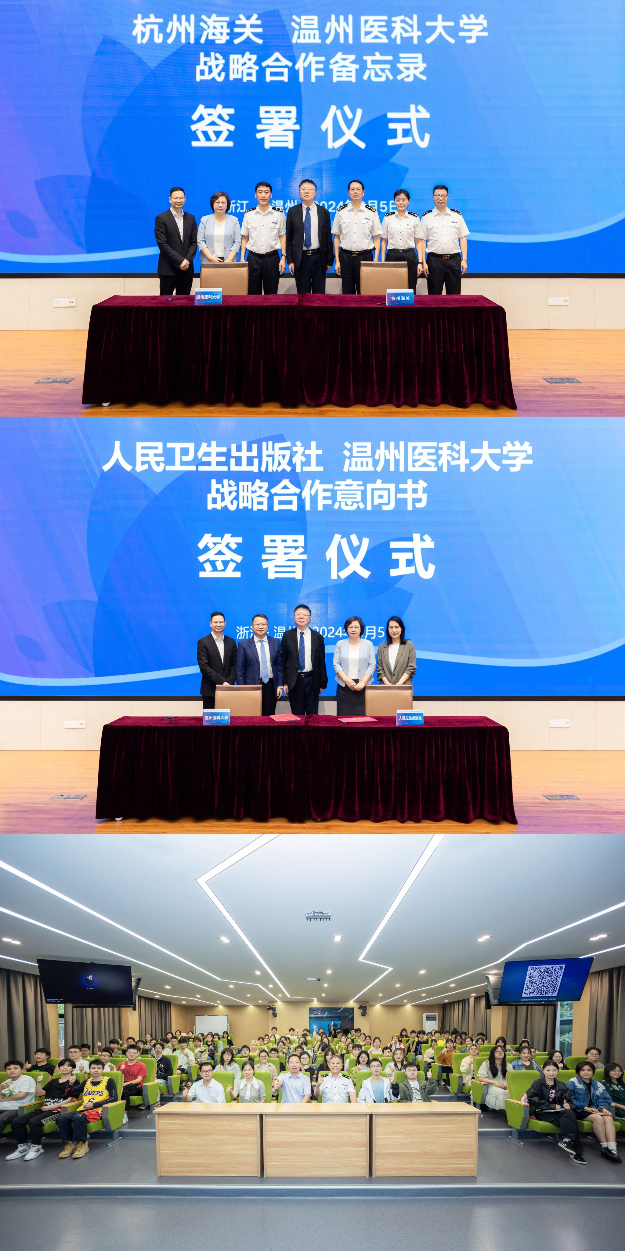 与人民卫生出版社、杭州海关签署战略合作备忘录,并邀请秦皇岛海关一级高级主办、教材编委聂维忠做教学论坛报告。多会融合,助力高水平公共卫生平台建设和高质量卫生检验检疫专业人才培养。