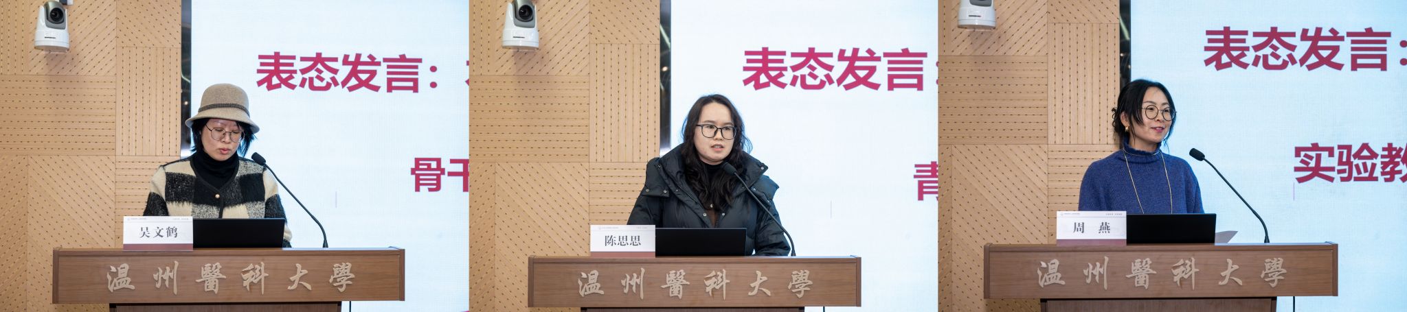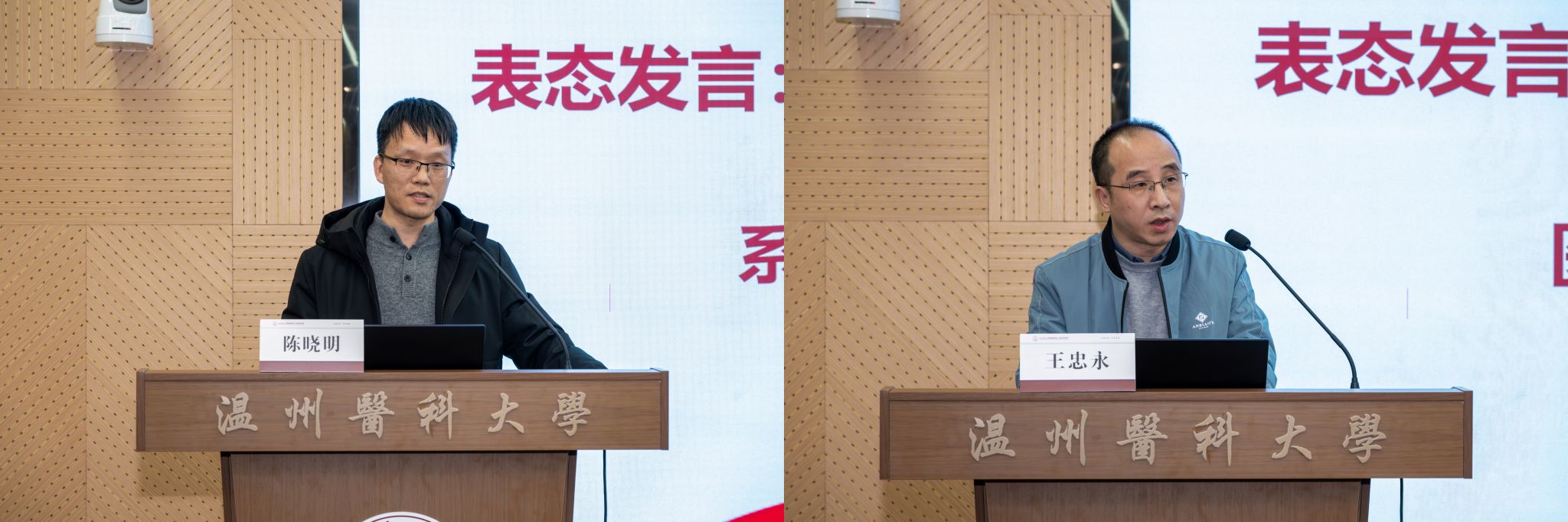 青年教师代表陈思思、骨干教师代表吴文鹤、实验教学中心教师代表周燕、医院教师代表王忠永、系主任代表陈晓明等老师上台做审核评估表态发言。