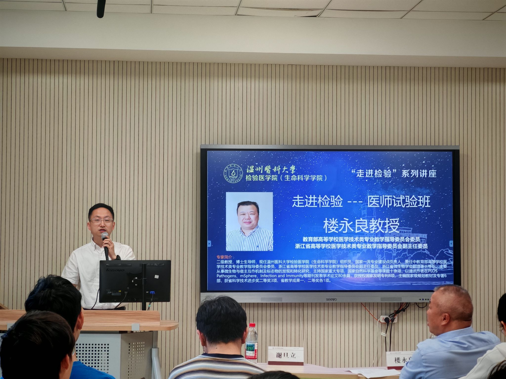 66日,本学期走进检验”系列讲座第十二讲在智慧教室6A101举行。教育部高等学校医学技术类专业教学指导委员会委员,浙江省高等学校医学技术类专业教学指导委员会副主任委员楼永良教授就检验医师的办学历程、人才培养和职业发展以及在临床诊断中的作用等内容与2024级临床医学(检验医师培养试验班)的同学进行了深入交流,本次活动由厂长资源 副院长谢旦立老师主持,教学办主任陈晨老师出席。