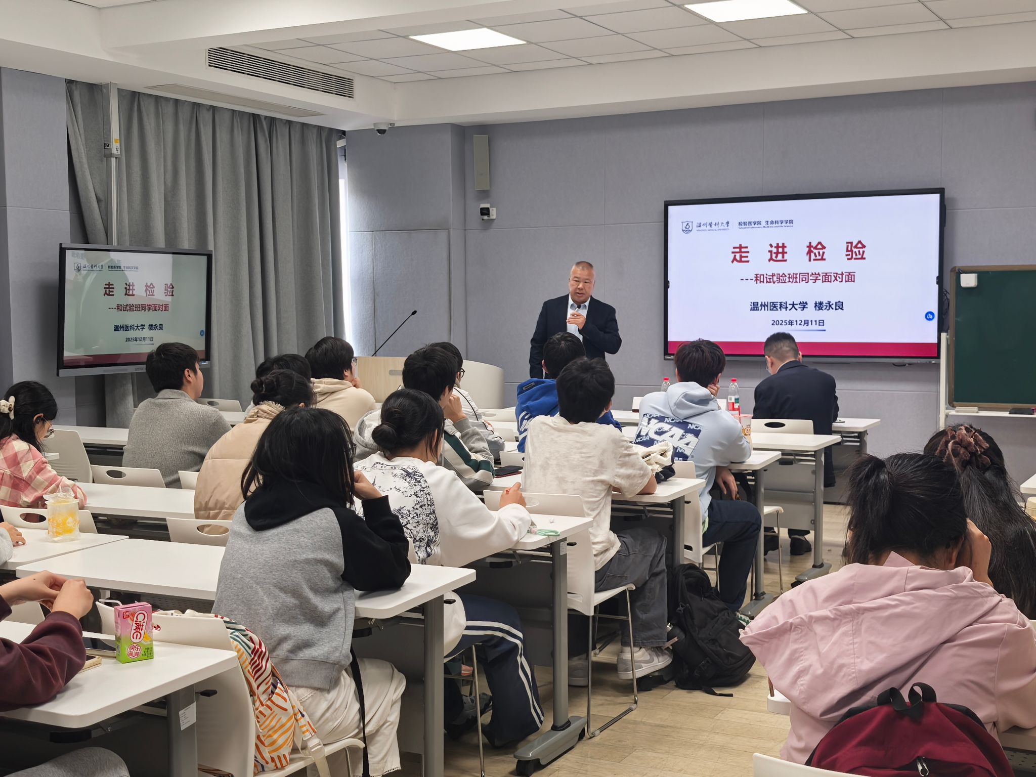 1211日,本学期走进检验”系列讲座第十在智慧教室6A302举行。教育部高等学校医学技术类专业教学指导委员会委员,浙江省高等学校医学技术类专业教学指导委员会副主任委员楼永良教授就检验医师的办学历程、人才培养和职业发展以及在临床诊断中的作用等内容与2025级临床医学(检验医师培养试验班)的同学进行了深入交流,本次活动由班主任邢超主持,教学办主任陈晨出席。