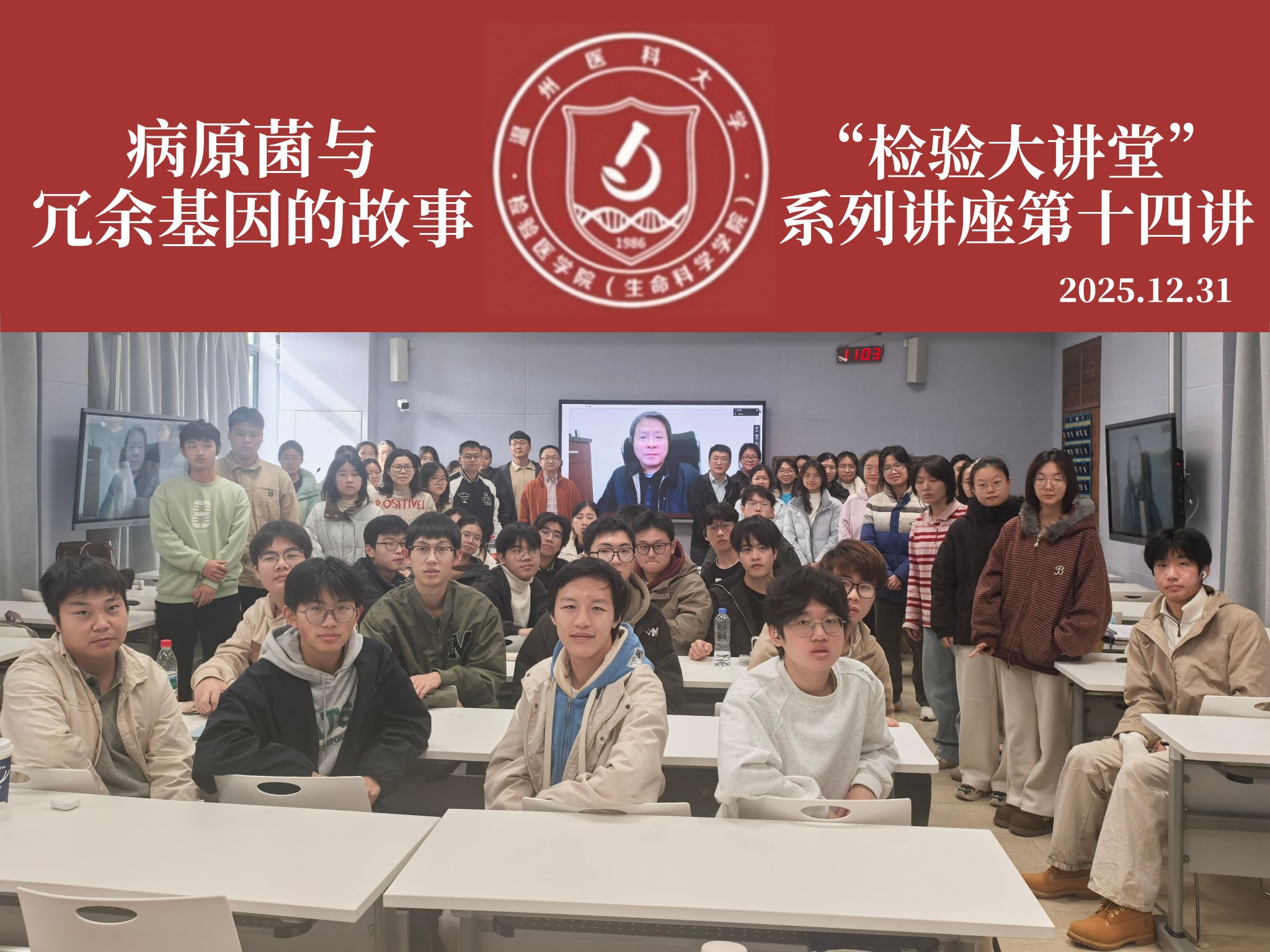 12月31日,本学期“检验大讲堂”系列讲座第十四讲在智慧教室6A204举行。北京大学未来技术学院党委书记朱怀球教授以“病原菌与冗余基因的关系”为主题与2024、2025级临床医学(检验医师培养试验班)的同学进行了交流,本次活动由学院副院长谢旦立主持,2025级临床医学(检验医师培养试验班)班主任邢超、专业教师李旭东、教学办主任陈晨出席。