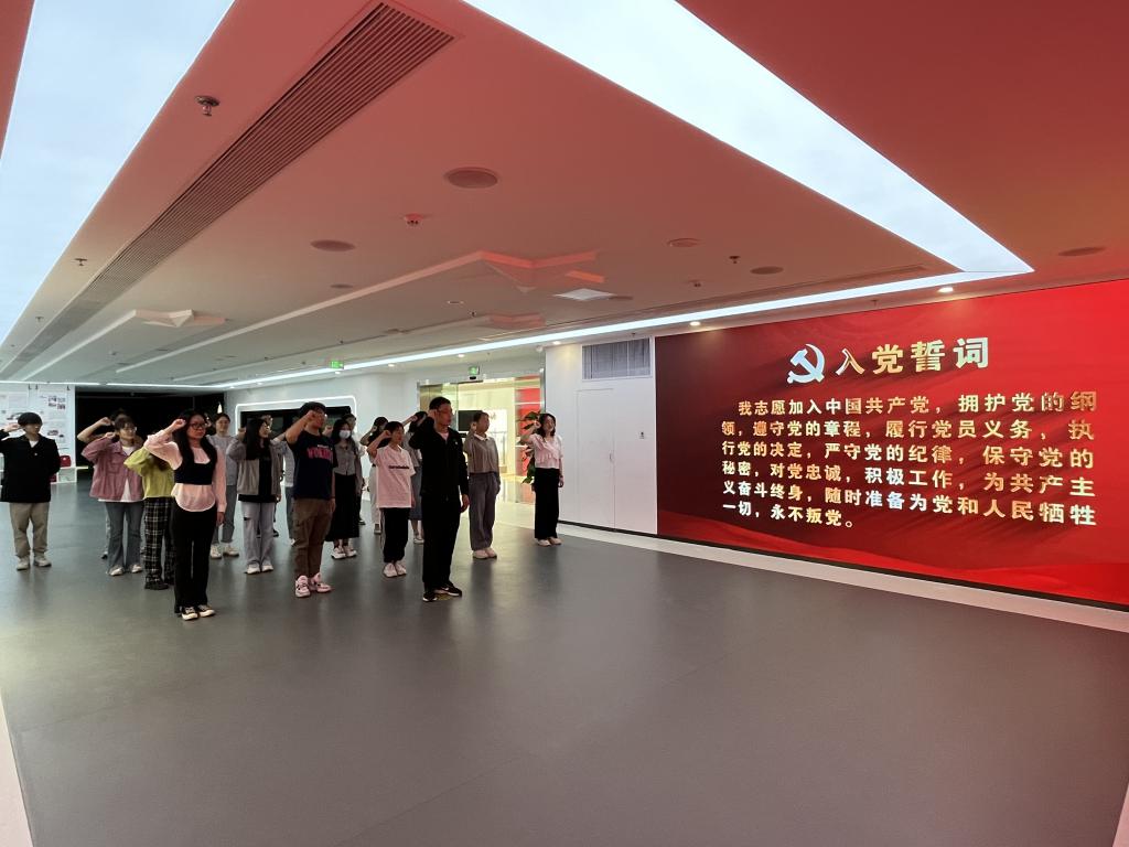 全体党员们一同穿过时光走廊、党史教育馆、红色理想区和党群服务区等特色区域版块,以数字大屏展现了温州百年奋斗历程留下的弥足珍贵的革命史料和红色印记,让党员们沉浸式学习了党的光辉史和温州发展史,接受了一次深刻的党史学习。在主题党日馆,全体党员面向党旗,庄严宣誓,重温入党誓词、牢记初心使命。