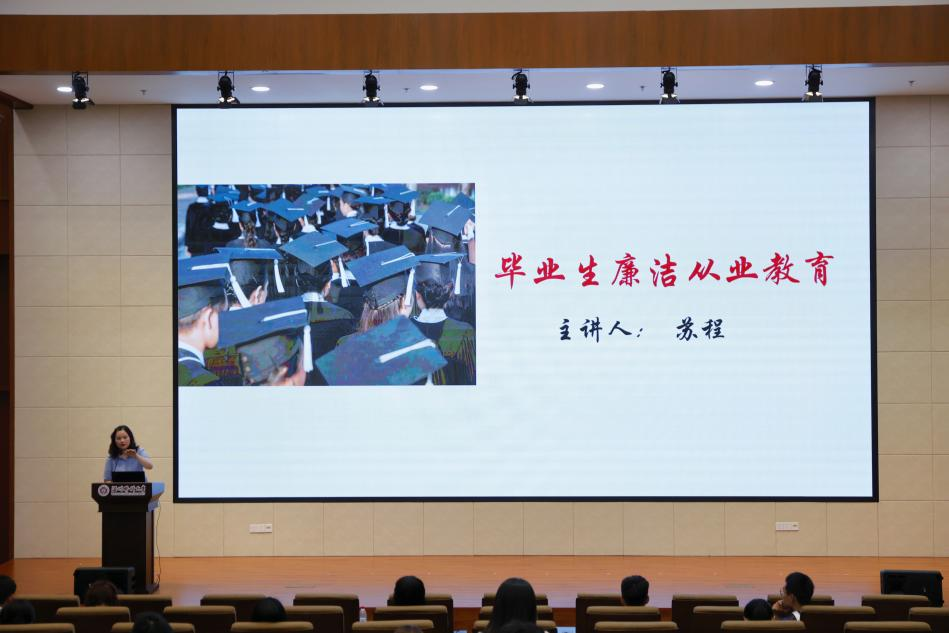 学位与研工办老师们对即将走向社会的毕业生们开展了廉洁从业教育与科研诚信教育。林虹老师结合未来同学们在工作中可能遇到的实际情况为同学们敲醒了警钟,同时引导同学们做好科研诚信。苏程老师引导毕业生们扣好走向社会的廉洁第一扣,做到慎初、慎微、慎独、慎行;要恪守廉洁诚信,懂得明辨是非。最后,在冯春林同学的带领下全体毕业生高举右手、庄严宣誓,誓言铮铮在报告厅久久回荡。
