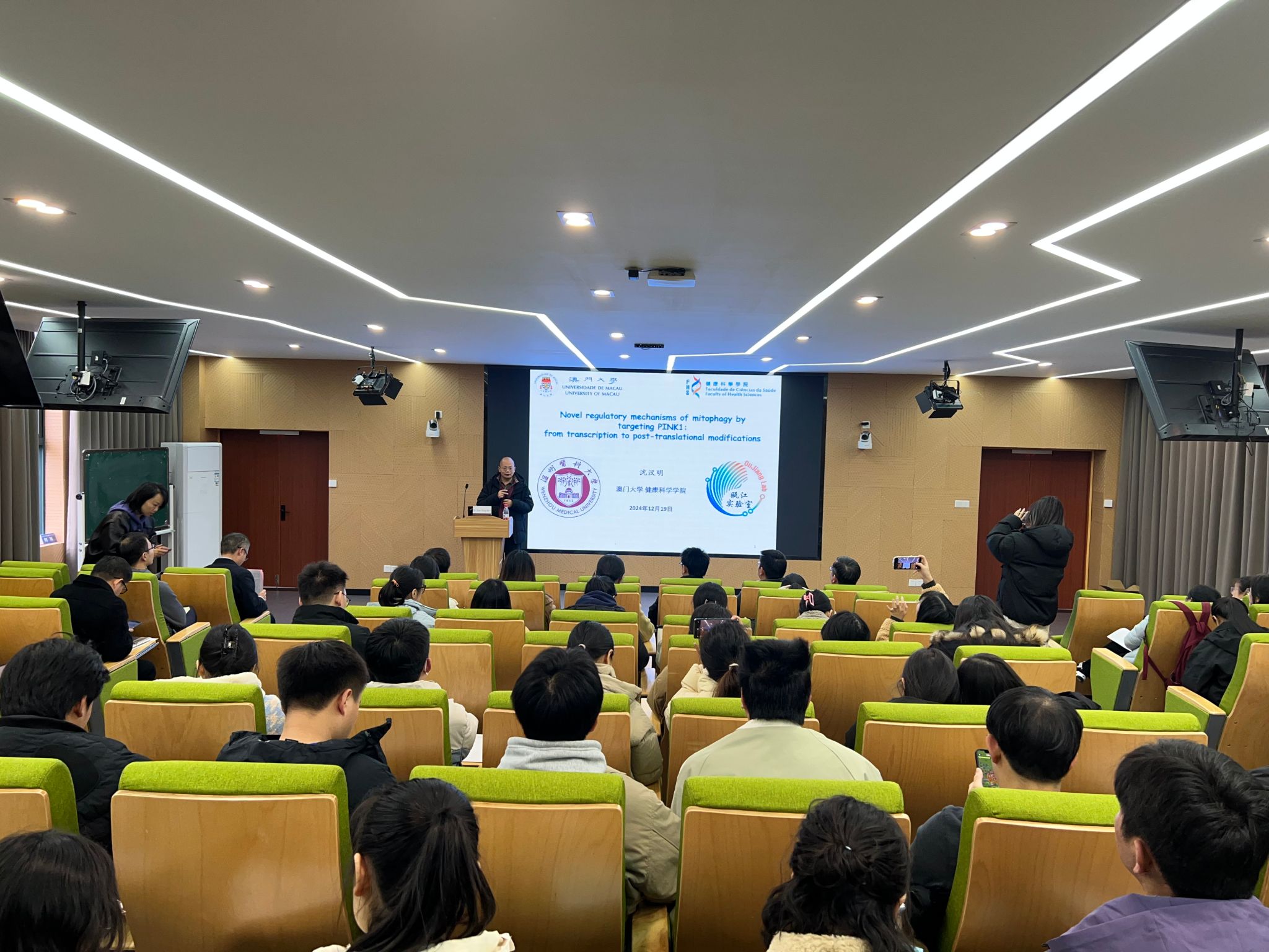开展求真讲坛专家讲座,本期讲坛主题为《Novel regulatory mechanisms of mitophagy by targeting PINK1, from transcription to post-translational modifications(靶向PINK1的线粒体自噬新调控机制,从转录到翻译后修饰)》,学院院长郑晓群、各学科带头人、青年科研骨干以及研究生代表参加,讲座由学院副院长黄海山主持。
