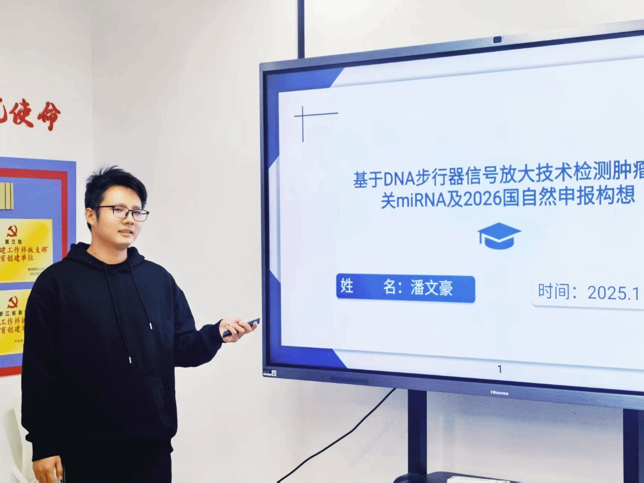 2025年11月11日下午,求真讲坛(院内专场)系列讲座之“基于DNA步行器信号放大技术检测肿瘤相关miRNA及2026年国自然申报构想”在生物医药科研大楼南702会议室举行。本次论坛由学院副院长黄海山主持,潘文豪博士主讲,学院PI及青年科研人员参加了本次学术交流活动。