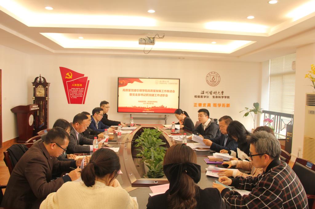 召开高质量党建引领高质量发展工作推进会暨党支部书记抓党建工作述职会议。校人事处处长楼永良,各党支部书记、科室负责人参加会议,会议由院党委副书记、纪委书记陈贤新主持。
