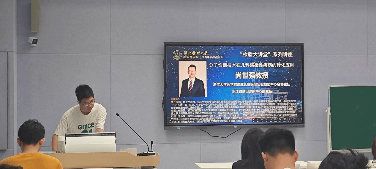 近日,本学期第二场“检验大讲堂”系列讲座在6B206举行。浙江大学医学院附属儿童医院实验检验中心名誉主任、浙江省基因诊断中心副主任尚世强教授围绕转化医学的重点、分子诊断技术在儿童感染性疾病中的转化应用和转化中遇到的问题等内容作精彩讲座。本次活动由王省淦同学主持,2023级、2024级临床医学(检验医师培养试验班)同学参加,2023级班主任周燕老师出席。