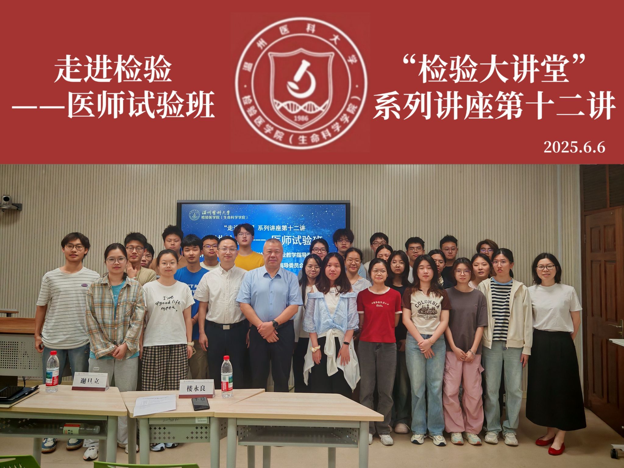 66日,本学期走进检验”系列讲座第十二讲在智慧教室6A101举行。教育部高等学校医学技术类专业教学指导委员会委员,浙江省高等学校医学技术类专业教学指导委员会副主任委员楼永良教授就检验医师的办学历程、人才培养和职业发展以及在临床诊断中的作用等内容与2024级临床医学(检验医师培养试验班)的同学进行了深入交流,本次活动由厂长资源 副院长谢旦立老师主持,教学办主任陈晨老师出席。